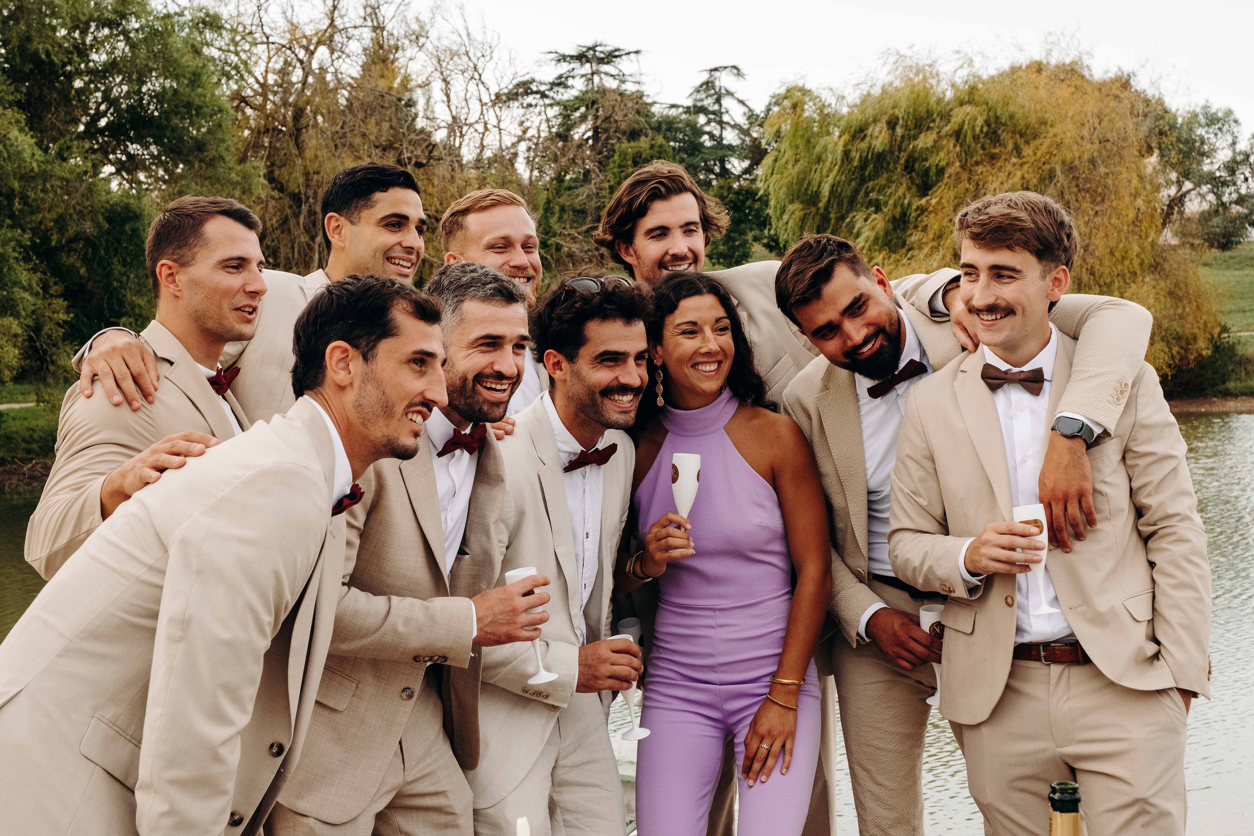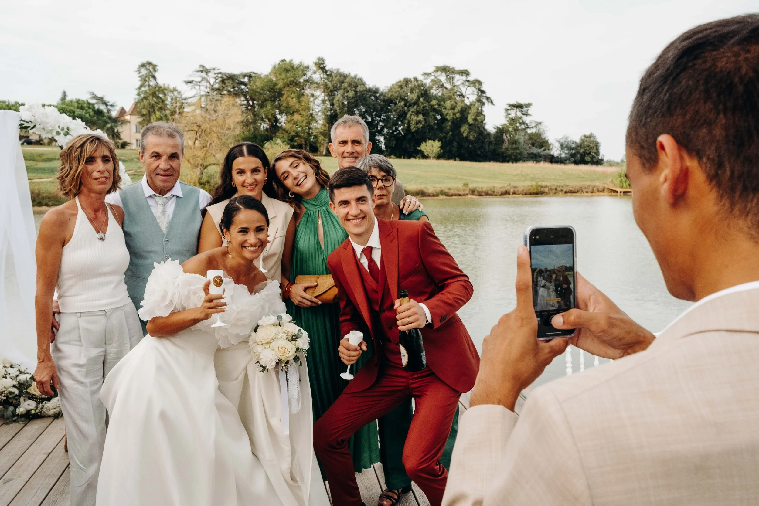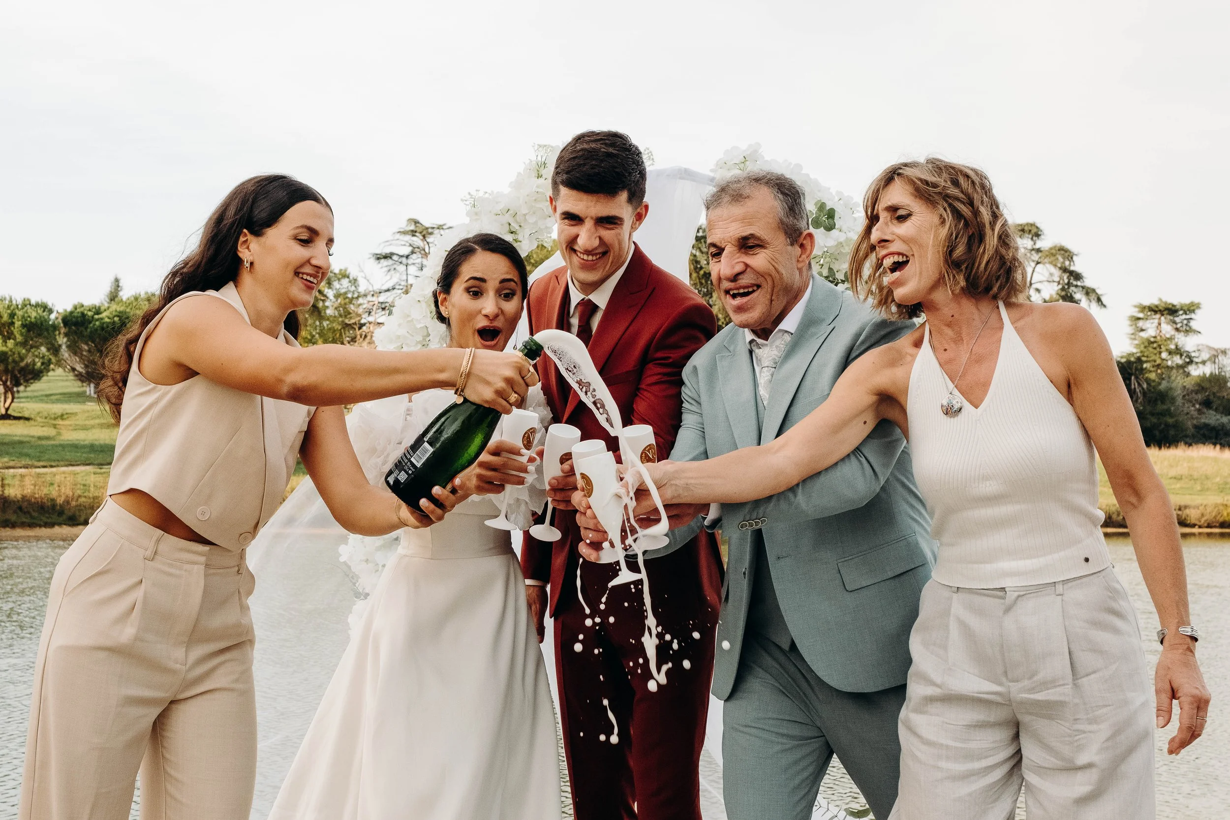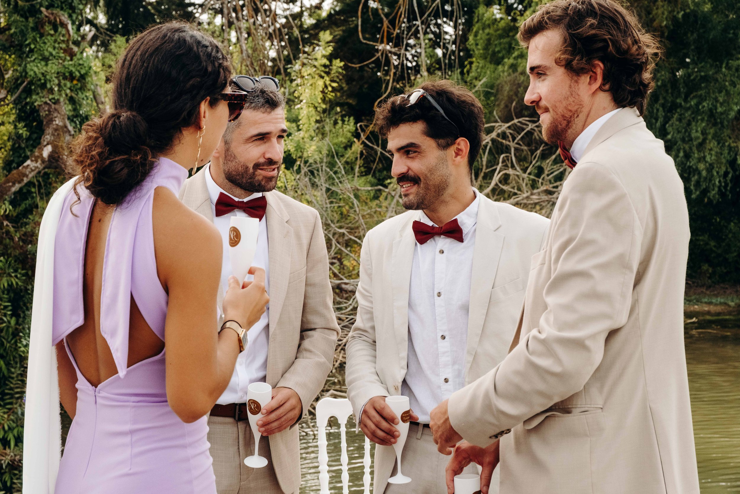 C’est le moment de célébrer ces nouveaux mariés ! Jusque là cachée dans une barque par les amis, la sortie d’une glacière remplie de bouteilles de champagne annonce le début du cocktail ! Les bouchons volent, les flûtes siglées Nina et Rodolphe tintent, l’ambiance est lancée. Du bonheur pur, des embrassades, des rires et beaucoup d’amour accompagne ces instants !