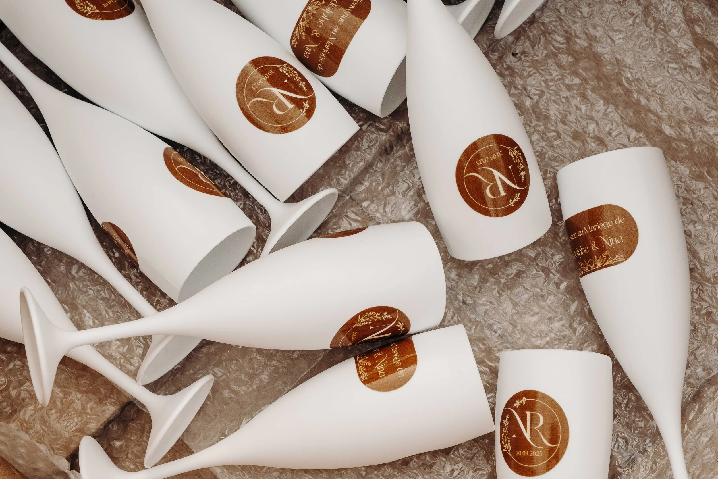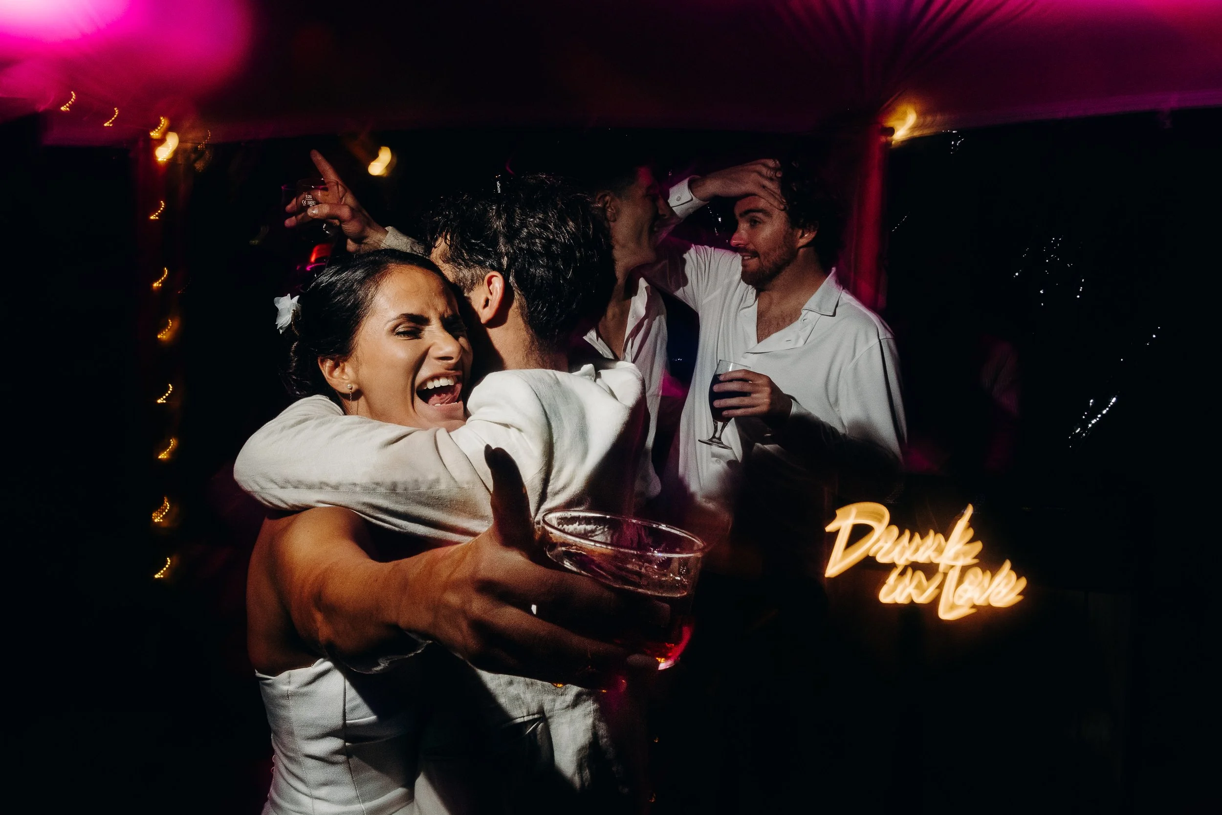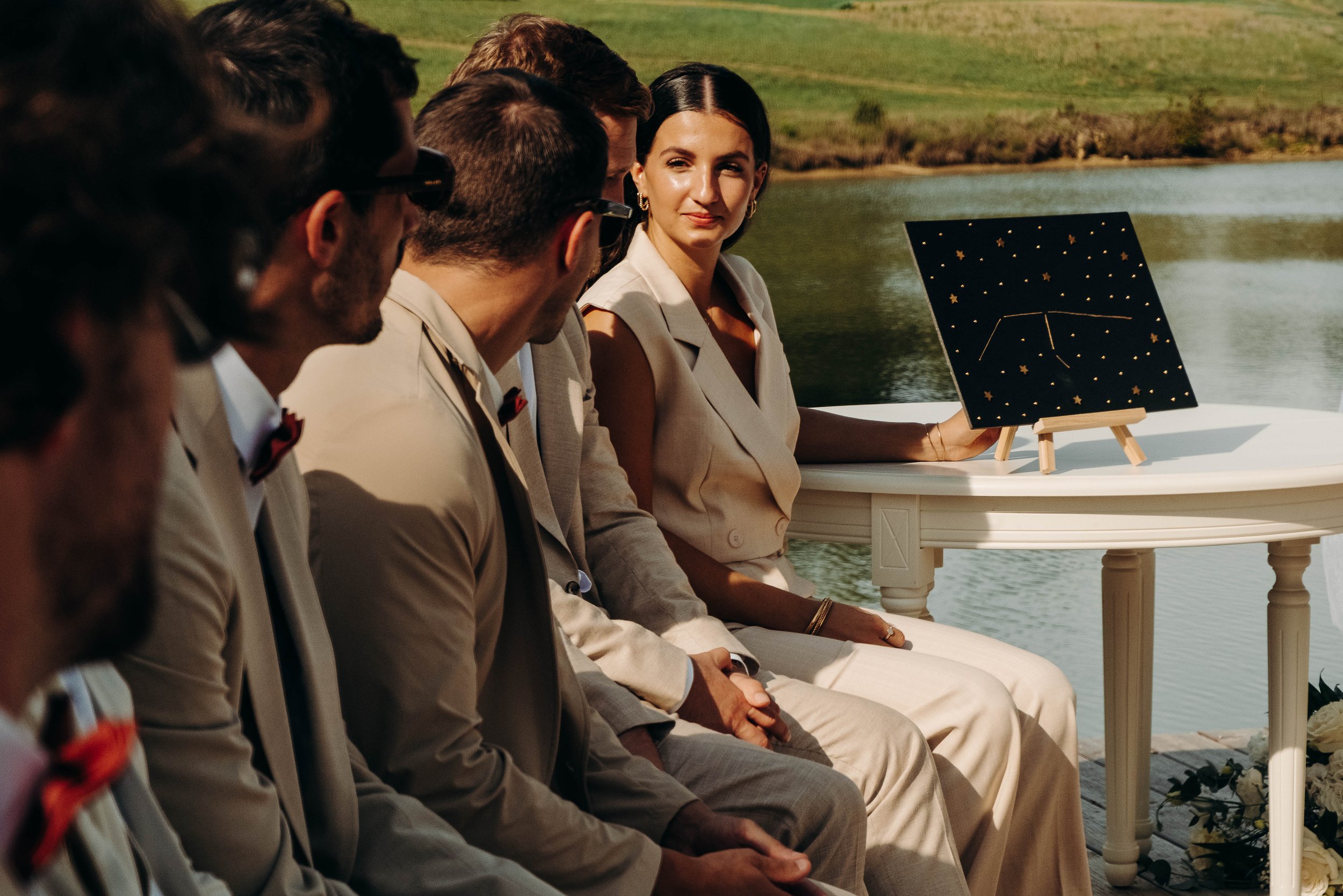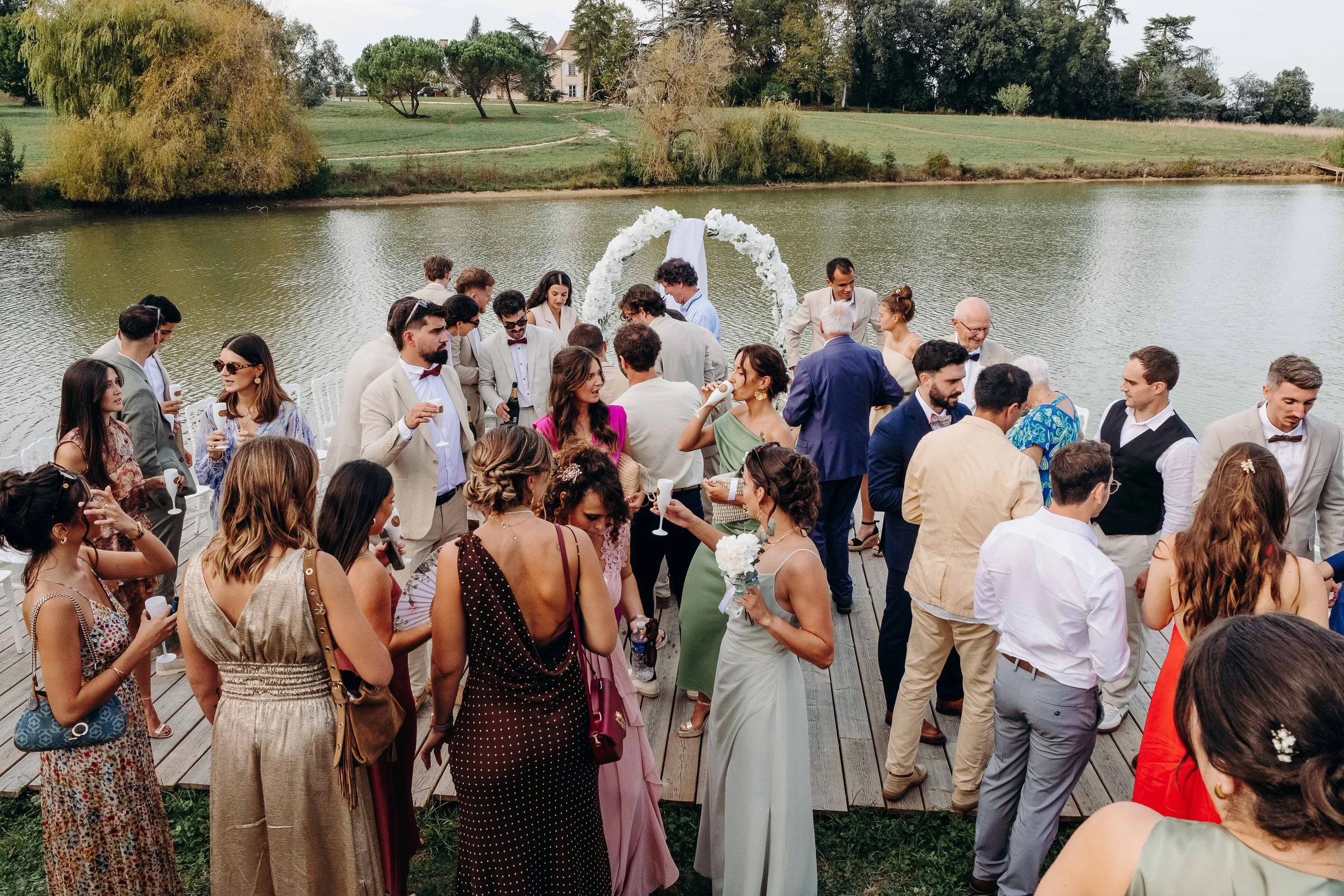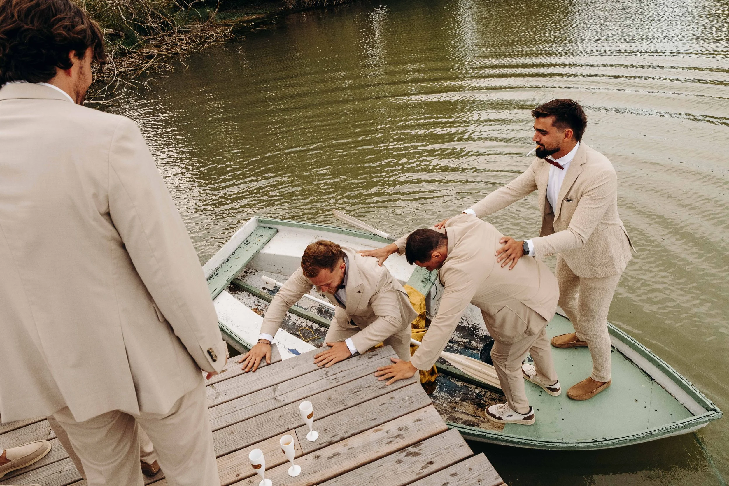 C’est le moment de célébrer ces nouveaux mariés ! Jusque là cachée dans une barque par les amis, la sortie d’une glacière remplie de bouteilles de champagne annonce le début du cocktail ! Les bouchons volent, les flûtes siglées Nina et Rodolphe tintent, l’ambiance est lancée. Du bonheur pur, des embrassades, des rires et beaucoup d’amour accompagne ces instants !