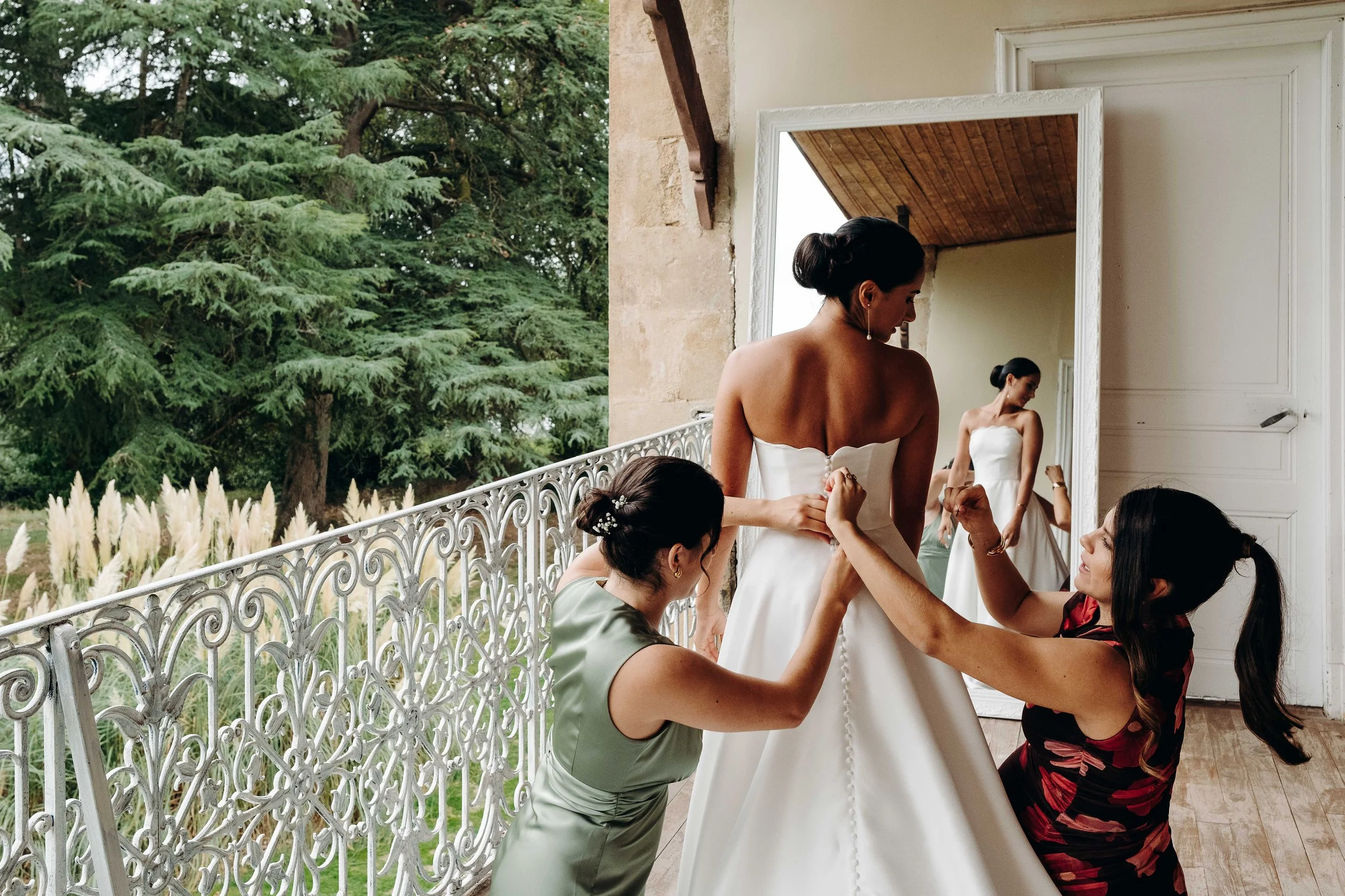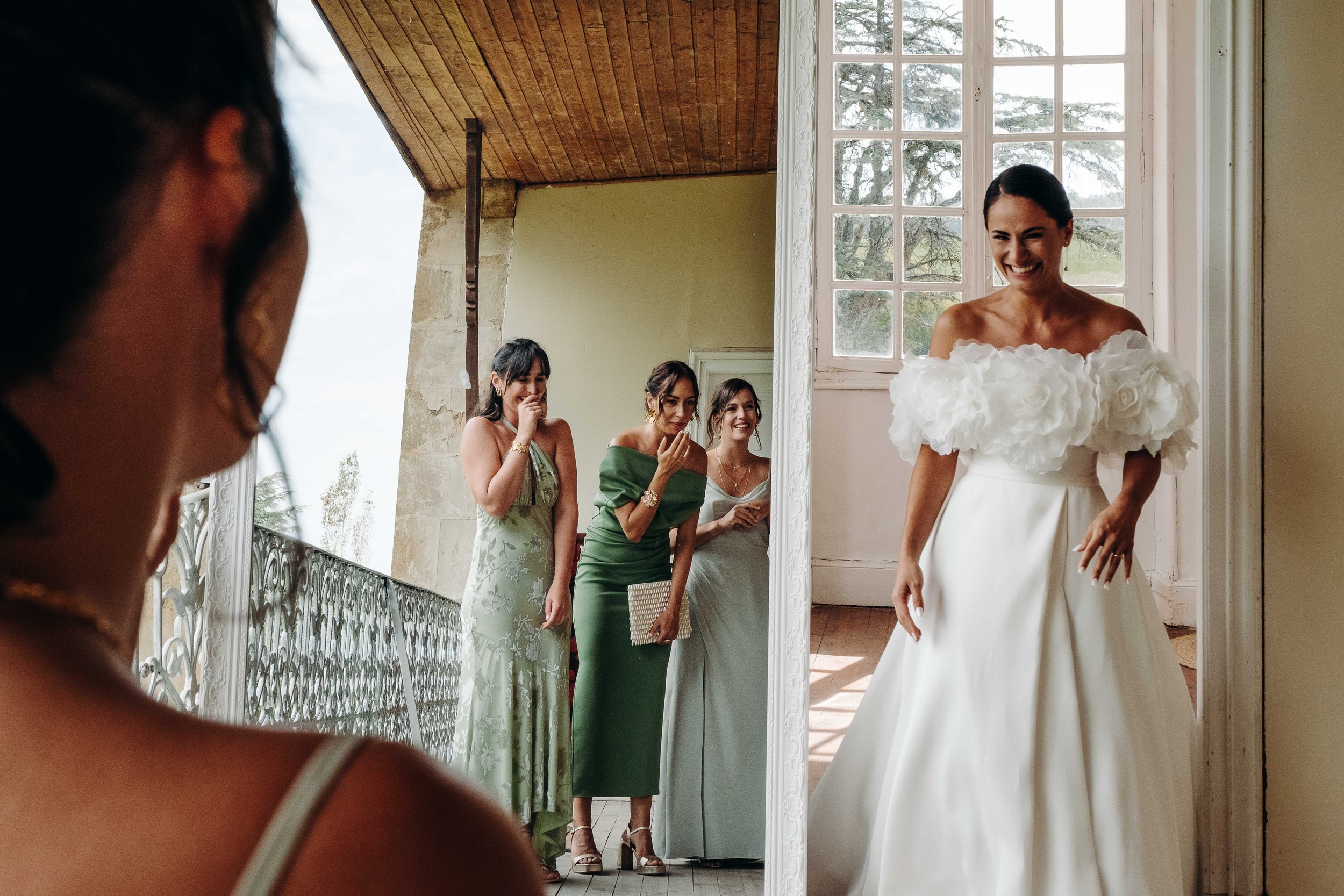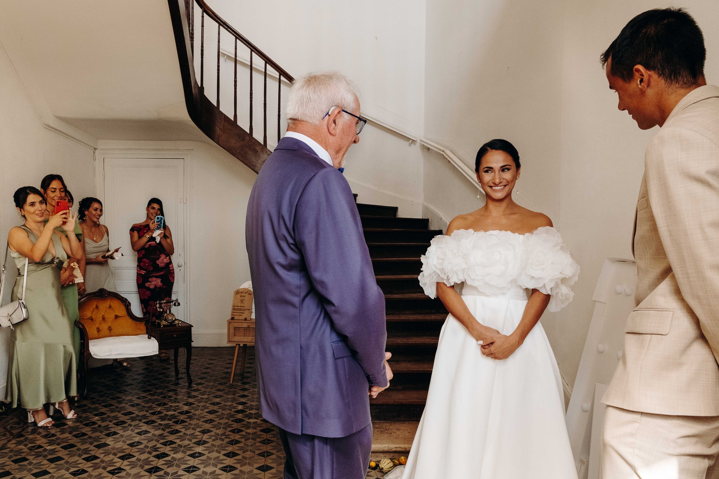 Ce sont ses témoins Morgane et Clara qui l’aident à passer sa robe Rosa Clara une fois que François et Margot ont eu fini la mise en beauté. Lorsque les demoiselles d’honneur sont arrivées pour la découvrir, les larmes ont coulé ! Puis ce fut au tour de son Papi et son frère de la découvrir. Les émotions étaient au plus haut, c’est dans ce contexte que l’on a pris la route pour la mairie de Mirande…